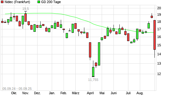 Mit dem Rücksetzer auf 13,98 EUR hat die Nidec-Aktie am 04.09.2025 die 200-Tage-Linie nach unten gekreuzt.Die Nidec-Aktie befand sich seit dem 13.08.2025 im langfristigen Aufwärtstrend ...weiterlesen