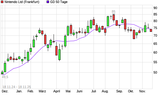 Mit dem Rücksetzer auf 72,96 EUR hat die Nintendo-Aktie am 17.11.2025 die 50-Tage-Linie nach unten gekreuzt.Die Nintendo-Aktie befindet sich seit dem 17.10.2025 im langfristigen Aufwärtstrend ...weiterlesen