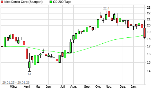 Mit dem Rücksetzer auf 18,30 EUR hat die Nitto Denko-Aktie am 28.01.2026 die 200-Tage-Linie nach unten gekreuzt.Die Nitto Denko-Aktie befand sich seit dem 11.07.2025 im langfristigen Abwärtstrend ...weiterlesen