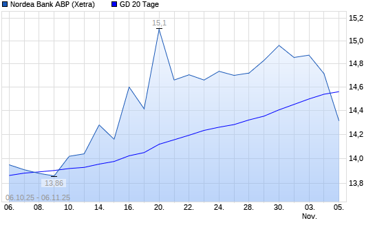 Mit dem Rücksetzer auf 14,34 EUR hat die Nordea Bank Abp-Aktie am 05.11.2025 die 20-Tage-Linie nach unten gekreuzt.Die Nordea Bank Abp-Aktie befindet sich seit dem 17.04.2025 im langfristigen ...weiterlesen