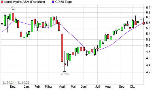 Mit dem Rücksetzer auf 5,74 EUR hat die Norsk Hydro-Aktie am 30.10.2025 die 50-Tage-Linie nach unten gekreuzt.Die Norsk Hydro-Aktie befindet sich seit dem 11.08.2025 im langfristigen Aufwärtstrend ...weiterlesen