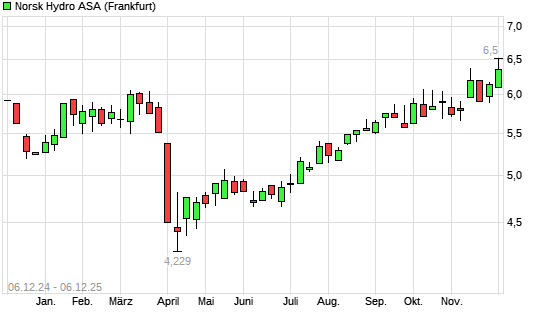 Mit dem Anstieg auf 6,36 EUR hat die Norsk Hydro-Aktie (ISIN NO0005052605) am 05.12.2025 ein neues 12-Monats-Hoch erreicht und damit den Kurs vom 12.11.2025 eingestellt.Die Norsk Hydro-Aktie ...weiterlesen