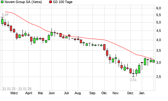 Mit dem Anstieg auf 3,01 EUR hat die Novem Group-Aktie am 30.01.2026 die 100-Tage-Linie nach oben gekreuzt.Die Novem Group-Aktie befindet sich seit dem 20.12.2024 im langfristigen Abwärtstrend ...weiterlesen