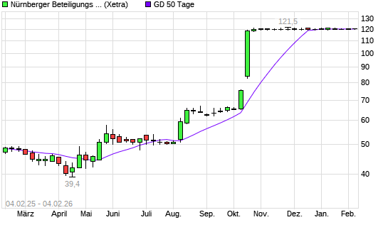 Mit dem Anstieg auf 120,00 EUR hat die Nürnberger Beteiligungs AG-Aktie am 03.02.2026 die 50-Tage-Linie nach oben gekreuzt.Die Nürnberger Beteiligungs AG-Aktie befindet sich seit dem 15.05.2025 ...weiterlesen