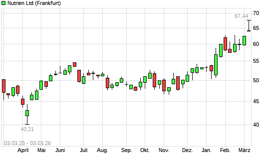 Mit dem Anstieg auf 64,60 EUR hat die Nutrien-Aktie (ISIN CA67077M1086) am 02.03.2026 ein neues 12-Monats-Hoch erreicht und damit den Kurs vom 27.02.2026 eingestellt.Die ...weiterlesen