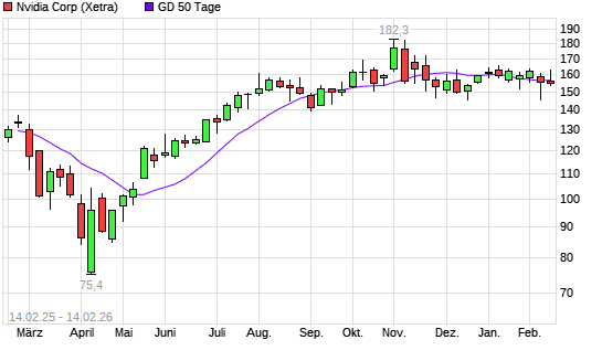 Mit dem Anstieg auf 159,68 EUR hat die Nvidia-Aktie am 18.02.2026 die 100-Tage-Linie nach oben gekreuzt.Die Nvidia-Aktie befindet sich seit dem 06.02.2026 im langfristigen ...weiterlesen