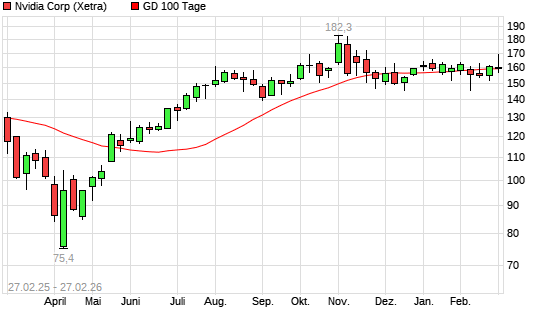 Mit dem Rücksetzer auf 156,66 EUR hat die Nvidia-Aktie am 26.02.2026 die 100-Tage-Linie nach unten gekreuzt.Die Nvidia-Aktie befindet sich seit dem 06.02.2026 im ...weiterlesen