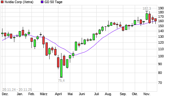 Mit dem Anstieg auf 161,90 EUR hat die Nvidia-Aktie am 19.11.2025 die 50-Tage-Linie nach oben gekreuzt.Die Nvidia-Aktie befindet sich seit dem 26.05.2025 im langfristigen Aufwärtstrend und hat ...weiterlesen