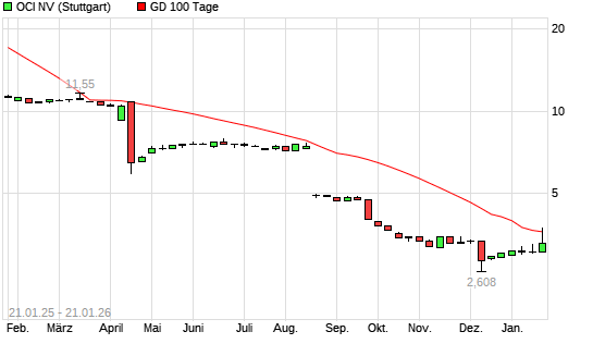 Mit dem Rücksetzer auf 3,36 EUR hat die OCI-Aktie am 20.01.2026 die 100-Tage-Linie nach unten gekreuzt.Die OCI-Aktie befindet sich seit dem 28.10.2024 im langfristigen Abwärtstrend und ...weiterlesen