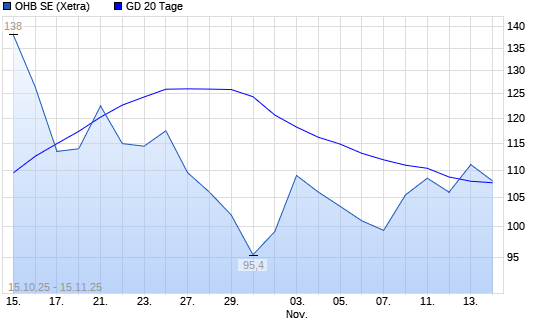 Mit dem Rücksetzer auf 104,50 EUR hat die OHB-Aktie am 14.11.2025 die 20-Tage-Linie nach unten gekreuzt.Die OHB-Aktie befindet sich seit dem 25.09.2025 im langfristigen Aufwärtstrend und ...weiterlesen