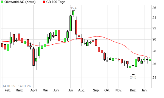 Mit dem Rücksetzer auf 26,70 EUR hat die Ökoworld-Aktie am 13.01.2026 die 100-Tage-Linie nach unten gekreuzt.Die Ökoworld-Aktie befindet sich seit dem 09.09.2025 im langfristigen Abwärtstrend ...weiterlesen