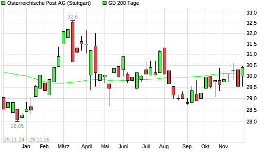 Mit dem Anstieg auf 30,30 EUR hat die Österreichische Post-Aktie am 28.11.2025 die 200-Tage-Linie nach oben gekreuzt.Die Österreichische Post-Aktie befand sich seit dem 27.11.2025 im langfristigen ...weiterlesen