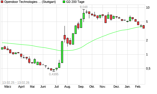Mit dem Rücksetzer auf 3,94 EUR hat die Opendoor Technologies-Aktie am 12.02.2026 die 200-Tage-Linie nach unten gekreuzt.Die Opendoor Technologies-Aktie befand sich seit dem 11.02.2026 ...weiterlesen