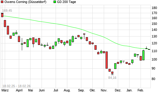 Mit dem Rücksetzer auf 109,95 EUR hat die Owens Corning-Aktie am 17.02.2026 die 200-Tage-Linie nach unten gekreuzt.Die Owens Corning-Aktie befand sich seit dem 16.02.2026 ...weiterlesen