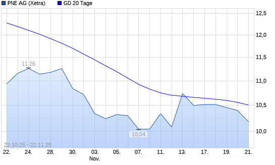 Mit dem Rücksetzer auf 10,26 EUR hat die PNE Wind-Aktie am 21.11.2025 die 20-Tage-Linie nach unten gekreuzt.Die PNE Wind-Aktie befindet sich seit dem 17.09.2025 im langfristigen Abwärtstrend ...weiterlesen
