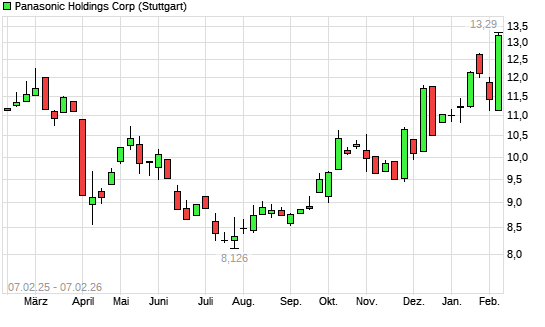 Mit dem Anstieg auf 13,45 EUR hat die Panasonic-Aktie (ISIN JP3866800000) am 06.02.2026 ein neues 5-Jahres-Hoch erreicht und damit den Kurs vom 05.02.2026 eingestellt.Die Panasonic-Aktie befindet ...weiterlesen