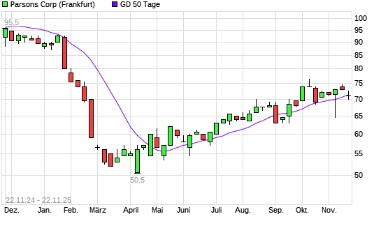 Mit dem Rücksetzer auf 71,00 EUR hat die Parsons-Aktie am 21.11.2025 die 50-Tage-Linie nach unten gekreuzt.Die Parsons-Aktie befindet sich seit dem 18.09.2025 im langfristigen Aufwärtstrend ...weiterlesen