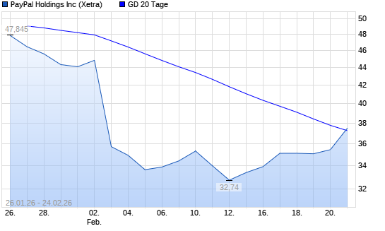 Mit dem Anstieg auf 37,66 EUR hat die PayPal-Aktie am 23.02.2026 die 20-Tage-Linie nach oben gekreuzt.Die PayPal-Aktie befindet sich seit dem 29.10.2025 im langfristigen Abwärtstrend ...weiterlesen