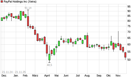 Mit dem Rücksetzer auf 50,50 EUR hat die PayPal-Aktie (ISIN US70450Y1038) am 20.11.2025 ein neues 12-Monats-Tief erreicht und damit den Kurs vom 19.11.2025 eingestellt.Die PayPal-Aktie ...weiterlesen