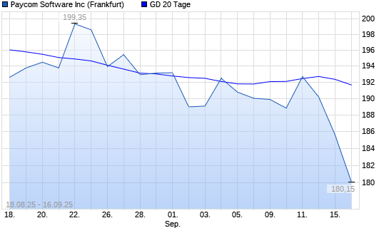 Mit dem Rücksetzer auf 189,05 EUR hat die Paycom Software-Aktie am 15.09.2025 die 20-Tage-Linie nach unten gekreuzt.Die Paycom Software-Aktie befindet sich seit dem 01.08.2025 im langfristigen ...weiterlesen