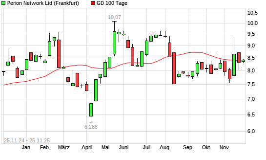 Mit dem Anstieg auf 8,41 EUR hat die Perion Network-Aktie am 24.11.2025 die 100-Tage-Linie nach oben gekreuzt.Die Perion Network-Aktie befindet sich seit dem 21.11.2025 im langfristigen Aufwärtstrend ...weiterlesen