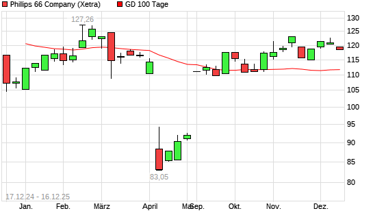 Mit dem Rücksetzer auf 112,02 EUR hat die Phillips 66-Aktie am 16.12.2025 die 100-Tage-Linie nach unten gekreuzt.Die Phillips 66-Aktie befindet sich seit dem 22.08.2025 im langfristigen ...weiterlesen