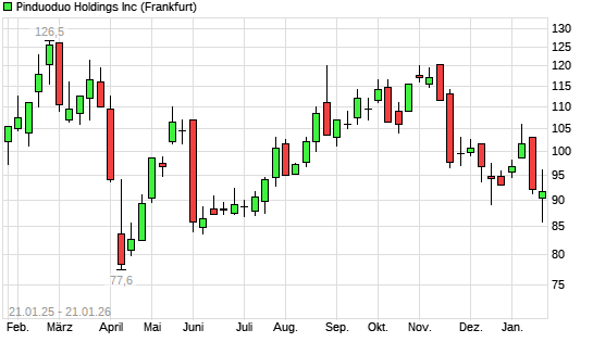 Mit dem Rücksetzer auf 86,00 EUR hat die Pinduoduo-Aktie (ISIN US7223041028) am 20.01.2026 ein neues 6-Monats-Tief erreicht und damit den Kurs vom 18.12.2025 eingestellt.Die Pinduoduo-Aktie ...weiterlesen