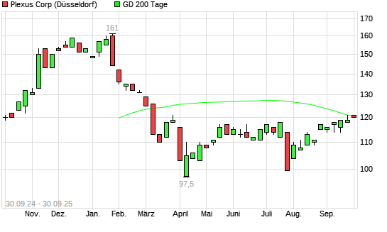 Mit dem Anstieg auf 122,00 EUR hat die Plexus-Aktie am 29.09.2025 die 200-Tage-Linie nach oben gekreuzt.Die Plexus-Aktie befand sich seit dem 26.09.2025 im langfristigen Abwärtstrend und hat ...weiterlesen
