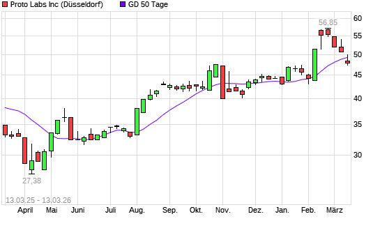 Mit dem Rücksetzer auf 47,74 EUR hat die Proto Labs-Aktie am 12.03.2026 die 50-Tage-Linie nach unten gekreuzt.Die Proto Labs-Aktie befindet sich seit dem 31.07.2025 im ...weiterlesen