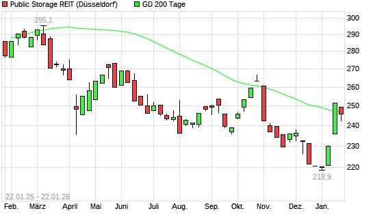 Mit dem Rücksetzer auf 239,20 EUR hat die Public Storage-Aktie am 23.01.2026 die 200-Tage-Linie nach unten gekreuzt.Die Public Storage-Aktie befand sich seit dem 22.01.2026 im langfristigen ...weiterlesen