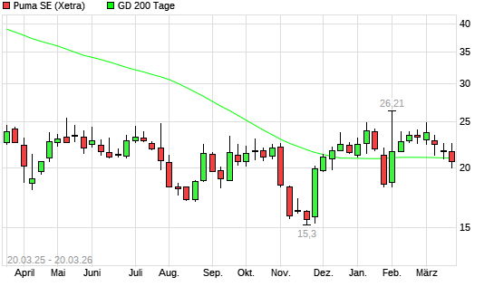 Mit dem Rücksetzer auf 20,77 EUR hat die Puma-Aktie am 19.03.2026 die 200-Tage-Linie nach unten gekreuzt.Die Puma-Aktie befand sich seit dem 26.01.2026 im langfristigen ...weiterlesen