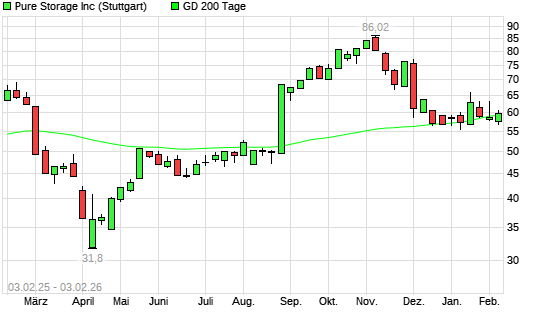 Mit dem Rücksetzer auf 59,05 EUR hat die Pure Storage-Aktie am 02.02.2026 die 200-Tage-Linie nach unten gekreuzt.Die Pure Storage-Aktie befand sich seit dem 12.01.2026 im langfristigen ...weiterlesen