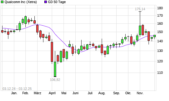 Mit dem Rücksetzer auf 146,74 EUR hat die Qualcomm-Aktie am 07.11.2025 die 20-Tage-Linie nach unten gekreuzt.Die Qualcomm-Aktie befindet sich seit dem 16.10.2025 im langfristigen Aufwärtstrend ...weiterlesen