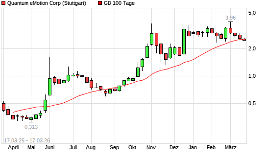 Mit dem Rücksetzer auf 2,53 EUR hat die Quantum eMotion-Aktie am 16.03.2026 die 100-Tage-Linie nach unten gekreuzt.Der Abstand zur 200-Tage-Linie beträgt aktuell +40,82%. ...weiterlesen
