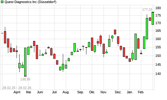 Mit dem Anstieg auf 178,05 EUR hat die Quest Diagnostics-Aktie (ISIN US74834L1008) am 27.02.2026 ein neues All-Time-High erreicht und damit den Kurs vom 25.02.2026 eingestellt.Die ...weiterlesen