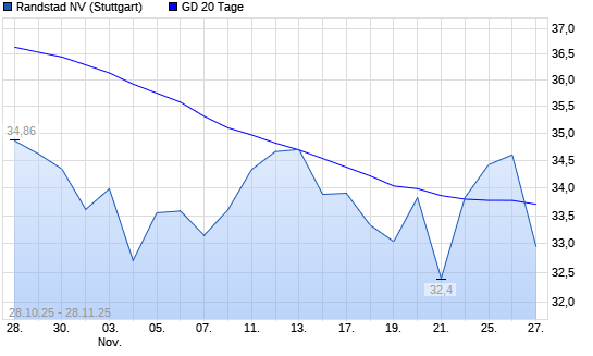 Mit dem Rücksetzer auf 32,89 EUR hat die Randstad-Aktie am 27.11.2025 die 20-Tage-Linie nach unten gekreuzt.Die Randstad-Aktie befindet sich seit dem 03.09.2025 im langfristigen Abwärtstrend ...weiterlesen