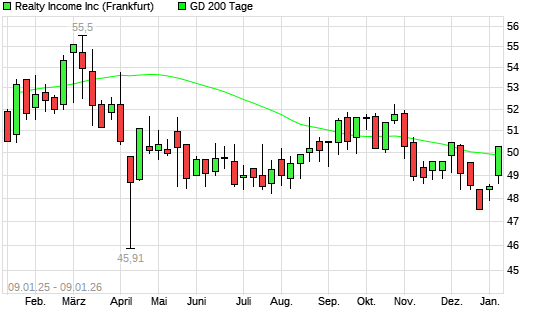 Mit dem Anstieg auf 50,26 EUR hat die Realty Income-Aktie am 08.01.2026 die 200-Tage-Linie nach oben gekreuzt.Die Realty Income-Aktie befand sich seit dem 08.12.2025 im langfristigen Abwärtstrend ...weiterlesen