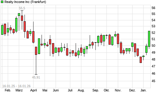 Mit dem Anstieg auf 52,05 EUR hat die Realty Income-Aktie (ISIN US7561091049) am 15.01.2026 ein neues 6-Monats-Hoch erreicht und damit den Kurs vom 20.10.2025 eingestellt.Die Realty Income-Aktie ...weiterlesen