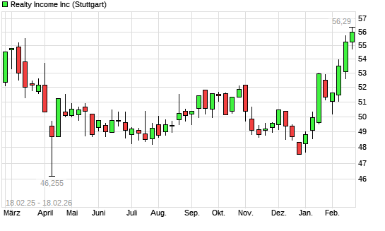 Mit dem Anstieg auf 56,26 EUR hat die Realty Income-Aktie (ISIN US7561091049) am 17.02.2026 ein neues 12-Monats-Hoch erreicht und damit den Kurs vom 16.02.2026 eingestellt.Die ...weiterlesen