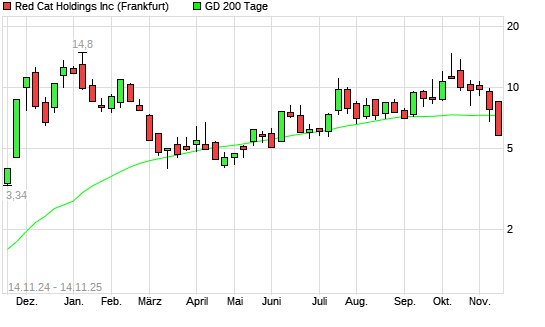 Mit dem Rücksetzer auf 7,02 EUR hat die Red Cat Holdings-Aktie am 13.11.2025 die 200-Tage-Linie nach unten gekreuzt.Die Red Cat Holdings-Aktie befand sich seit dem 08.09.2025 im langfristigen ...weiterlesen