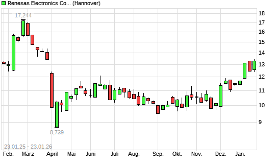 Mit dem Anstieg auf 13,37 EUR hat die Renesas Electronics-Aktie (ISIN JP3164720009) am 22.01.2026 ein neues 6-Monats-Hoch erreicht und damit den Kurs vom 09.01.2026 eingestellt.Die Renesas Electronics-Aktie ...weiterlesen