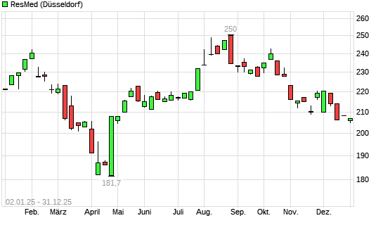 Mit dem Rücksetzer auf 205,10 EUR hat die Resmed-Aktie (ISIN US7611521078) am 30.12.2025 ein neues 6-Monats-Tief erreicht und damit den Kurs vom 19.12.2025 eingestellt.Die Resmed-Aktie ...weiterlesen