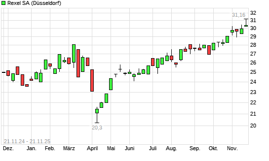 Rexel ist Teil des 1683 Titel umfassenden Anlageuniversum der boerse.de-Signale Aktien Welt. In der großen Trendauswertung vom 21.11.2025 ist der Titel von Rang 533 auf Rang 332 aufgestiegen.Gesteuert ...weiterlesen