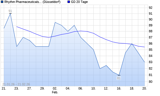 Mit dem Anstieg auf 83,00 EUR hat die Rhythm Pharmaceuticals-Aktie am 20.02.2026 die 20-Tage-Linie nach oben gekreuzt.Die Rhythm Pharmaceuticals-Aktie befindet sich seit dem 30.06.2025 ...weiterlesen