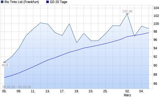 Mit dem Anstieg auf 99,35 EUR hat die Rio Tinto-Aktie am 04.03.2026 die 20-Tage-Linie nach oben gekreuzt.Die Rio Tinto-Aktie befindet sich seit dem 25.09.2025 im ...weiterlesen