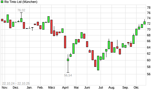 Mit dem Anstieg auf 73,00 EUR hat die Rio Tinto-Aktie (ISIN AU000000RIO1) am 21.10.2025 ein neues 6-Monats-Hoch erreicht und damit den Kurs vom 20.10.2025 eingestellt.Die Rio Tinto-Aktie befindet ...weiterlesen