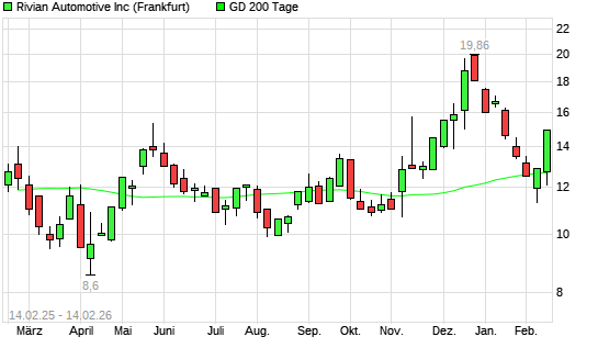 Mit dem Anstieg auf 14,90 EUR hat die Rivian Automotive-Aktie am 13.02.2026 die 200-Tage-Linie nach oben gekreuzt.Die Rivian Automotive-Aktie befand sich seit dem 11.02.2026 im langfristigen ...weiterlesen