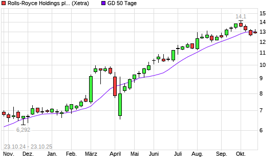 Mit dem Rücksetzer auf 12,90 EUR hat die Rolls-Royce-Aktie am 22.10.2025 die 50-Tage-Linie nach unten gekreuzt.Die Rolls-Royce-Aktie befindet sich seit dem 21.12.2022 im langfristigen Aufwärtstrend ...weiterlesen