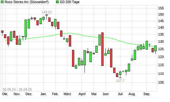 Mit dem Anstieg auf 126,88 EUR hat die Ross Stores-Aktie am 25.09.2025 die 200-Tage-Linie nach oben gekreuzt.Die Ross Stores-Aktie befand sich seit dem 15.09.2025 im langfristigen Aufwärtstrend ...weiterlesen