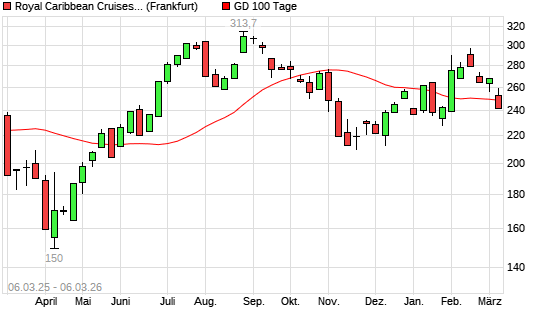 Mit dem Rücksetzer auf 243,95 EUR hat die Royal Caribbean Cruises-Aktie am 05.03.2026 die 100-Tage-Linie nach unten gekreuzt.Die Royal Caribbean Cruises-Aktie befindet sich seit ...weiterlesen